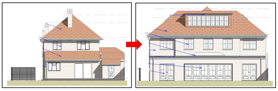 Cameron Jones Planning appealed this decision with the Planning Inspectorate, arguing the proposal would assimilate better with the original dwelling and provide a connected design. The significance of the heritage asset of the Sheen Common Drive Conservation Area on this part of Berwyn Road is the high quality individually designed large detached houses set in generous gardens. The application plot is wide and could comfortably accommodate the proposed two-storey and single-storey extensions and roof additions.